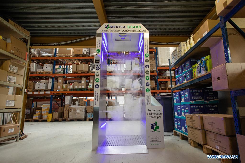 Photo taken on April 21, 2021 shows a disinfection tunnel offered by First Distribution Soveclat (FDS), specialized in hygiene products, in Sartrouville, near Paris, France. (Photo by Aurelien Morissard/Xinhua)