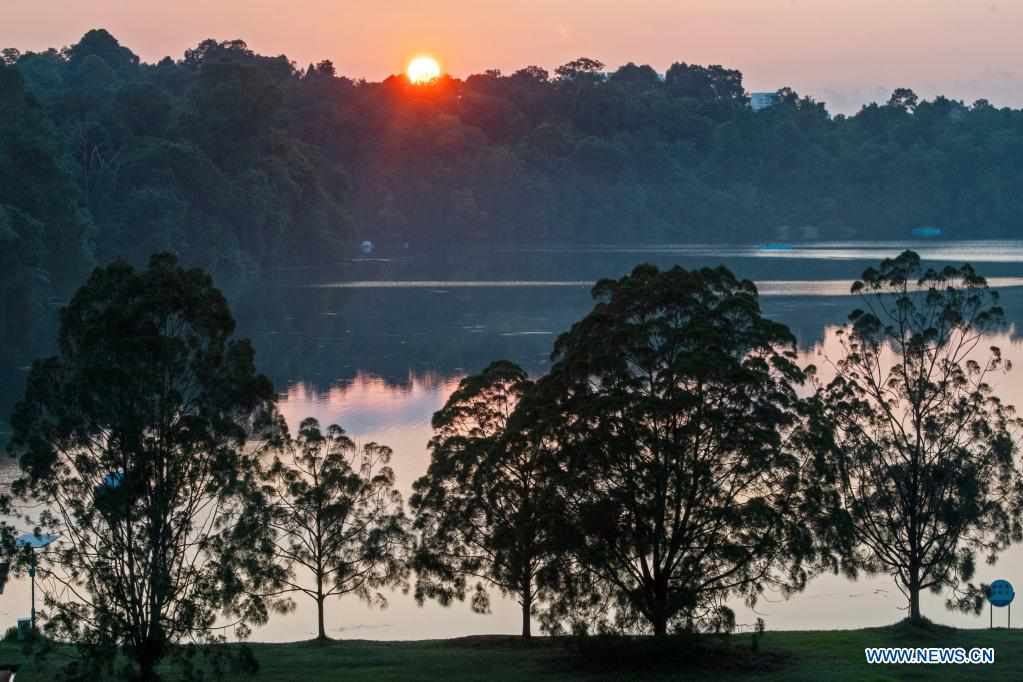 The morning sun rises from the forest in Singapore's Central Catchment Nature Reserve on April 21, 2021. (Photo by Then Chih Wey/Xinhua)