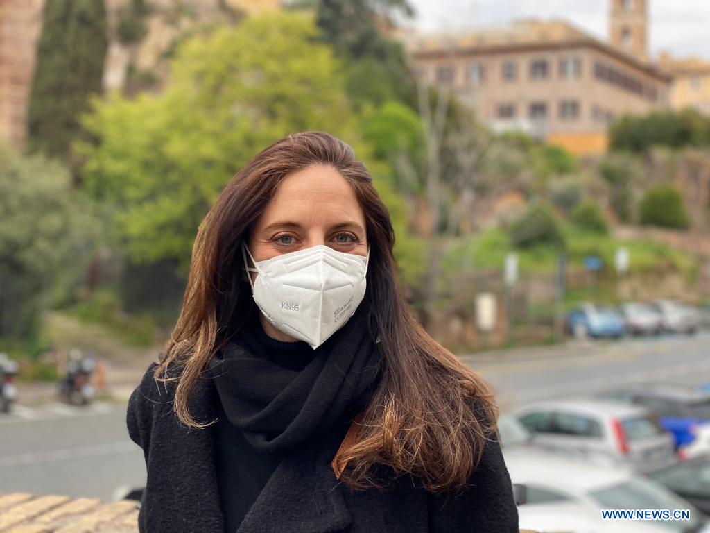 Maria Rosaria Di Napoli, an art history teacher, poses for a photo in Rome, Italy, on April 21, 2021. The City of Rome celebrated its birthday with a day-long series of events on Wednesday -- but, due to the ongoing coronavirus lockdown, the commemorations were muted. (Str/Xinhua)