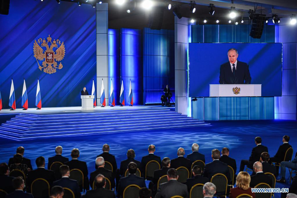 Russian President Vladimir Putin delivers his annual address to the Federal Assembly in Moscow, Russia, April 21, 2021. (Photo by Evgeny Sinitsyn/Xinhua)