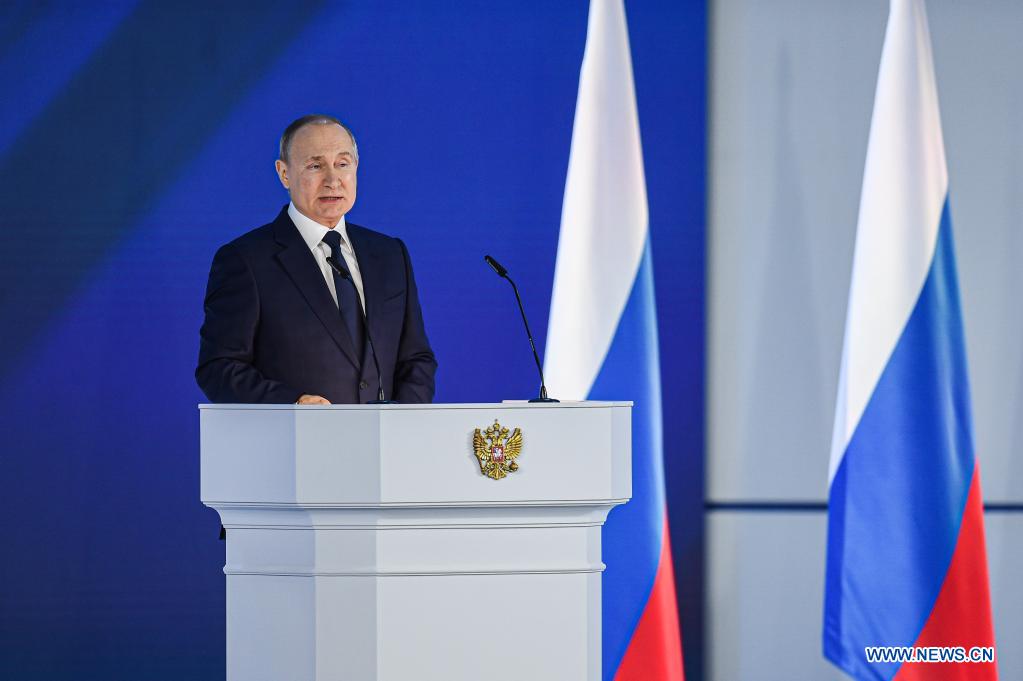 Russian President Vladimir Putin delivers his annual address to the Federal Assembly in Moscow, Russia, April 21, 2021. (Photo by Evgeny Sinitsyn/Xinhua)