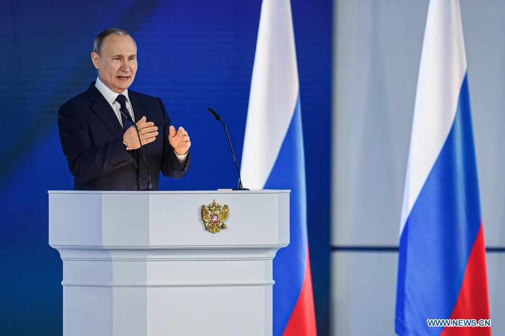Russian President Vladimir Putin delivers his annual address to the Federal Assembly in Moscow, Russia, April 21, 2021. (Photo by Evgeny Sinitsyn/Xinhua)