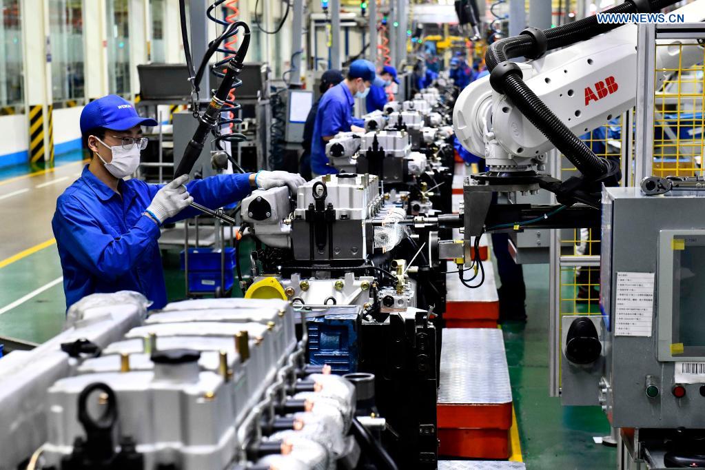 Workers assemble engines on an assembly line at a workshop of the Weichai Power Co., Ltd. in Weifang City, east China's Shandong province, April 22, 2021. The technology of producing high-end diesel engine used to be a bottleneck for China's equipment manufacturing industry. Weichai Power Co., Ltd., a state-owned enterprise founded in 1946, has developed China's first high-speed and high-power engine with completely independent intellectual property rights after more than ten years of scientific and technological research, completely ending China's long-term reliance on foreign technologies for heavy commercial vehicles. In 2018, Weichai won the first prize of the State Scientific and Technological Progress Award, and embarked on a path towards international market and high-quality development. (Xinhua/Guo Xulei)