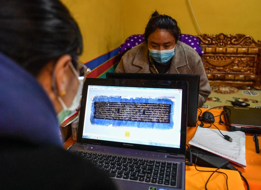 Staff members with the regional ancient book protection center upload digital scans of rare ancient books to an online platform under the official website of the Tibet Library in Lhasa, southwest China's Tibet Autonomous Region, April 20, 2021. (Xinhua/Jigme Dorje)