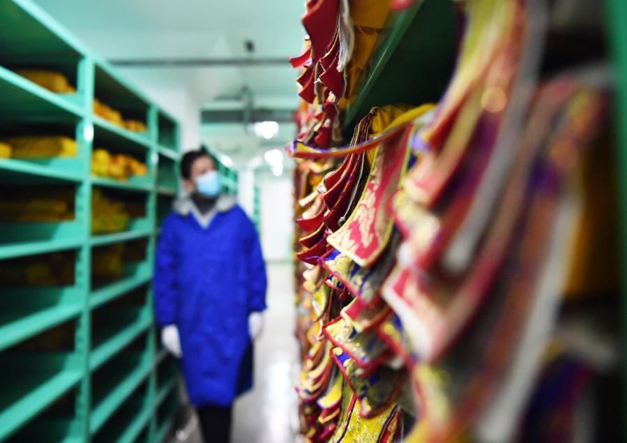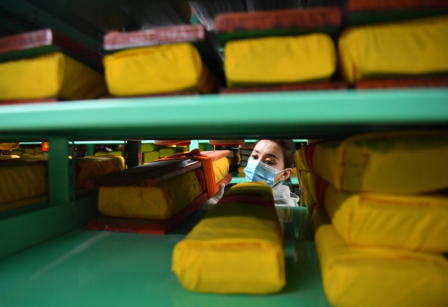 A staff member with the regional ancient book protection center arranges rare ancient books in Lhasa, southwest China's Tibet Autonomous Region, April 21, 2021. (Xinhua/Jigme Dorje)