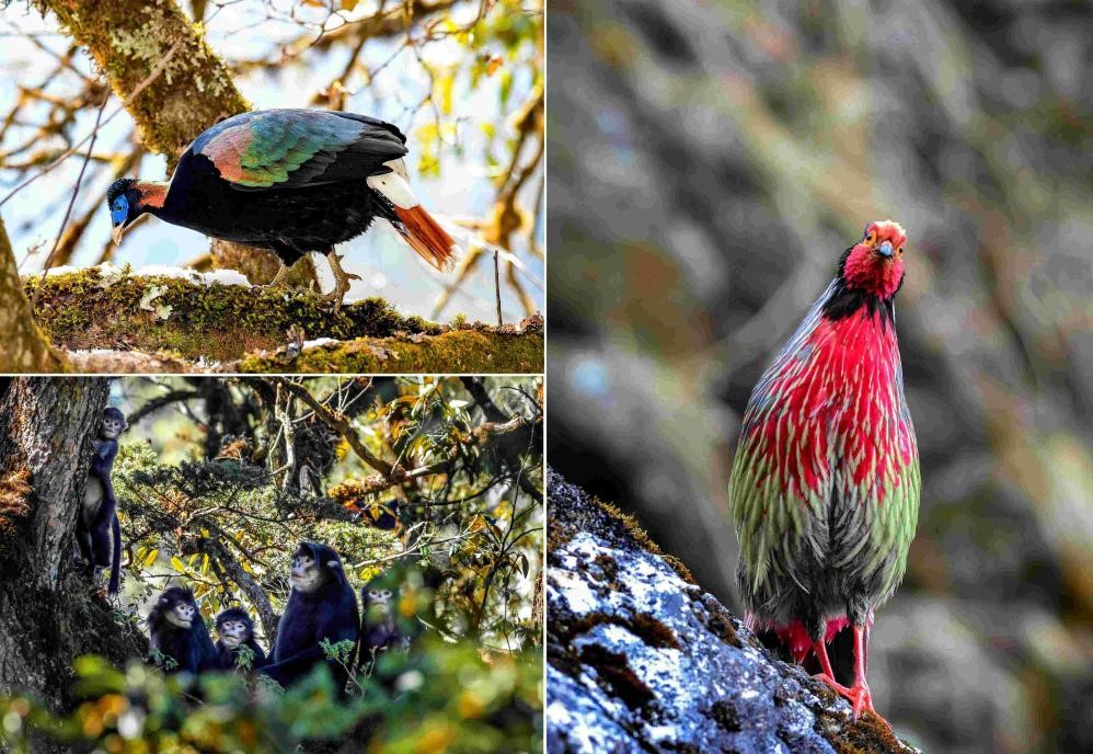 Photo shows protected wildlife in the Gaoligong Mountain National Nature Reserve, including crestless monal (upper left), black snub-nosed monkeys (lower left), and blood pheasant (right). (Photo provided by the Gaoligong Mountain National Nature Reserve)