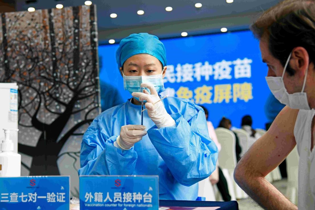A nurse administers COVID-19 vaccine to a foreigner at Sino-Europe (Changzhou) Testing ,Inspection and Certification Cooperation Industrial Park, east China's Jiangsu province, April 14. (Photo by Xia Chenxi/People's Daily Online)