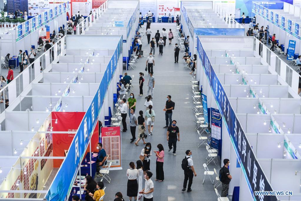 Applicants search for job opportunities at a job fair during the 19th Conference on International Exchange of Professionals (CIEP) in Shenzhen, south China's Guangdong Province, April 24, 2021. The conference kicked off in China's tech hub Shenzhen on Saturday, attracting over 1,200 professional institutions and organizations as well as over 10,000 government representatives, experts and high-end talents from more than 30 countries and regions. (Xinhua/Mao Siqian)