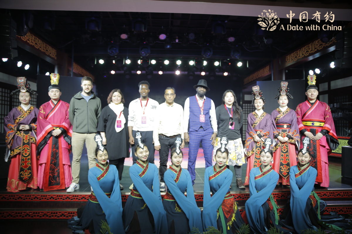 Members of "A Date with China" 2021 international media tour have photos with local performers. [Photo/chinadaily.com.cn]