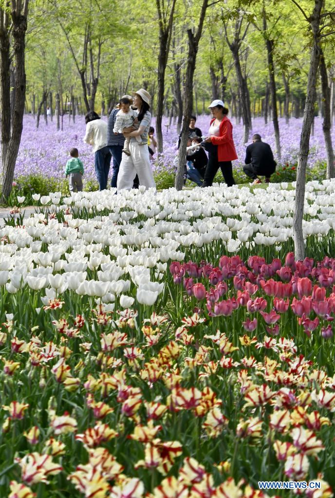 Citizens enjoy the scenery of blooming flowers by Yongding River in Daxing District of Beijing, capital of China, April 24, 2021. (Xinhua/Li Xin)