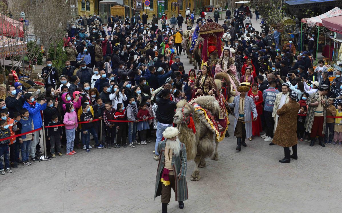 Tourists watch a camel show in Kashgar, Xinjiang Uygur autonomous region, on Sunday. China has seen an increase in people traveling during this year's Qingming Festival, Tomb Sweeping Day holiday, which was from Saturday to Monday. [Photo by Adiljan/China News Service]
