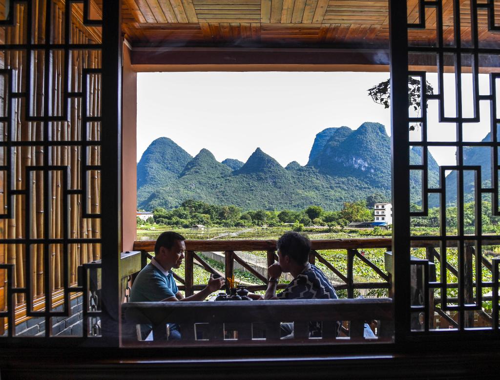 Photo taken on July 4, 2020 shows visitors drinking tea at a family inn in Yangshuo County, south China's Guangxi Zhuang Autonomous Region. (Xinhua/Cao Yiming)