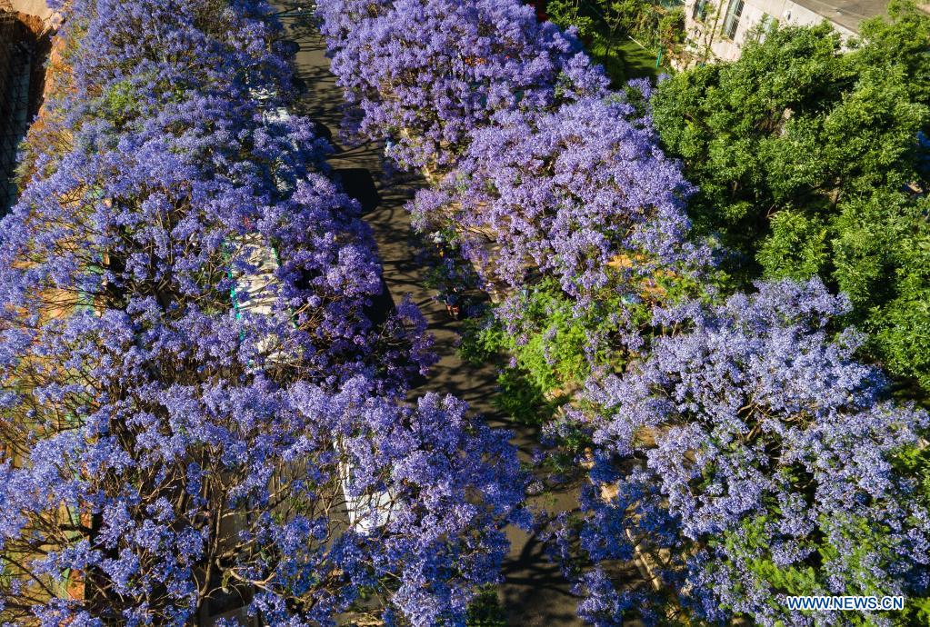 Aerial photo taken on April 25, 2021 shows blooming jacaranda flowers on a road in Kunming, capital of southwest China's Yunnan Province. (Xinhua/Wang Guansen)