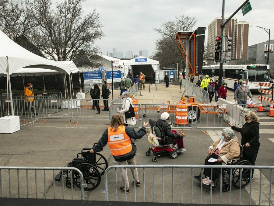 People line up to enter a mass COVID-19 vaccination site at the United Center in Chicago, the United States, on March 10, 2021. (Photo by Joel Lerner/Xinhua)