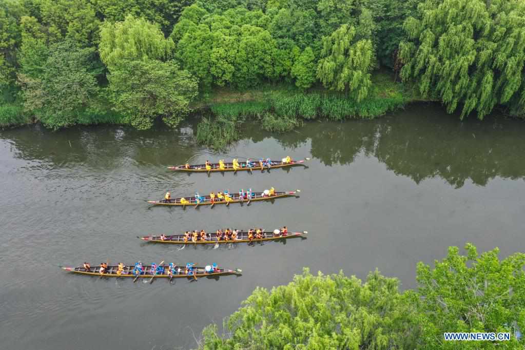 Aerial photo taken on April 27, 2021 shows that locals row dragon boats at Qinhu Lake in Taizhou, east China's Jiangsu Province. Local authorities in Taizhou City have been promoting sports tourism by building sports centers in wetlands, ball games centers, physical development training camps and other sports venues to boost local tourism market. (Xinhua/Yang Lei)