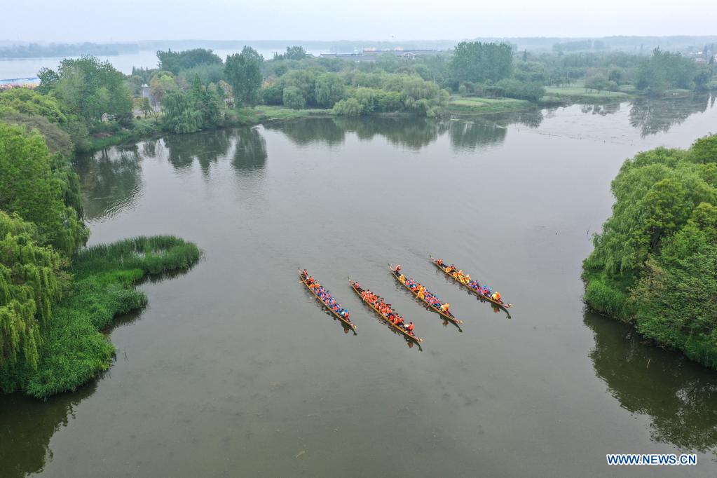 Aerial photo taken on April 27, 2021 shows that locals row dragon boats at Qinhu Lake in Taizhou, east China's Jiangsu Province. Local authorities in Taizhou City have been promoting sports tourism by building sports centers in wetlands, ball games centers, physical development training camps and other sports venues to boost local tourism market. (Xinhua/Yang Lei)