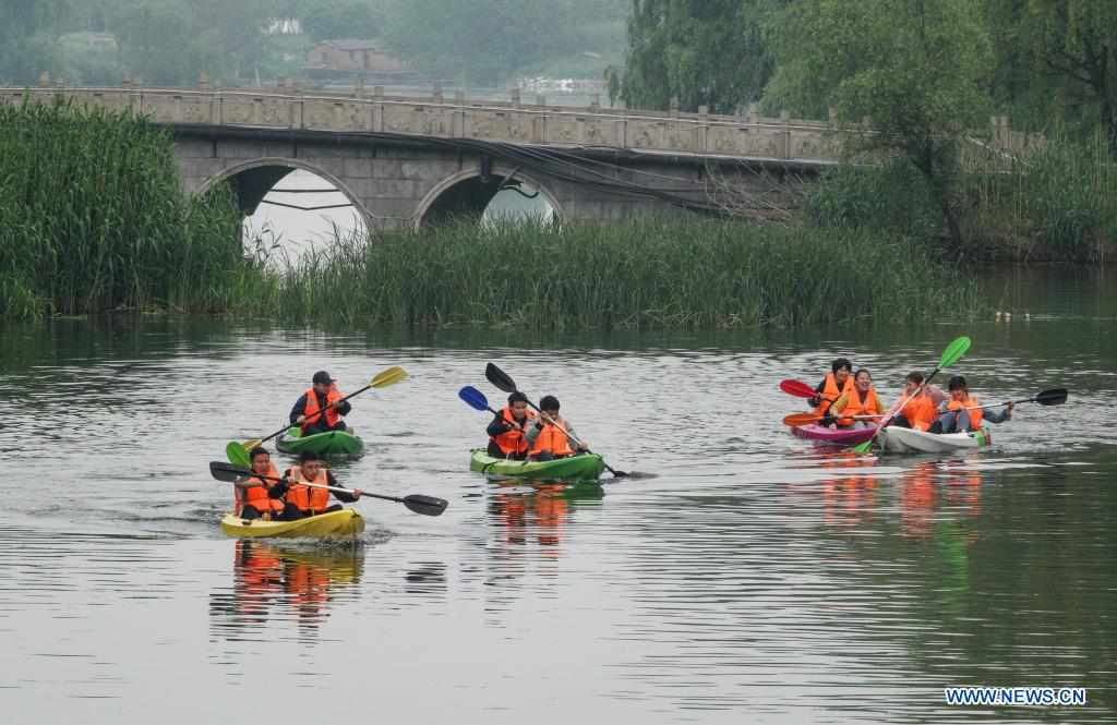 Tourists kayak at Qinhu Lake in Taizhou, east China's Jiangsu Province, on April 27, 2021. Local authorities in Taizhou City have been promoting sports tourism by building sports centers in wetlands, ball games centers, physical development training camps and other sports venues to boost local tourism market. (Xinhua/Yang Lei)