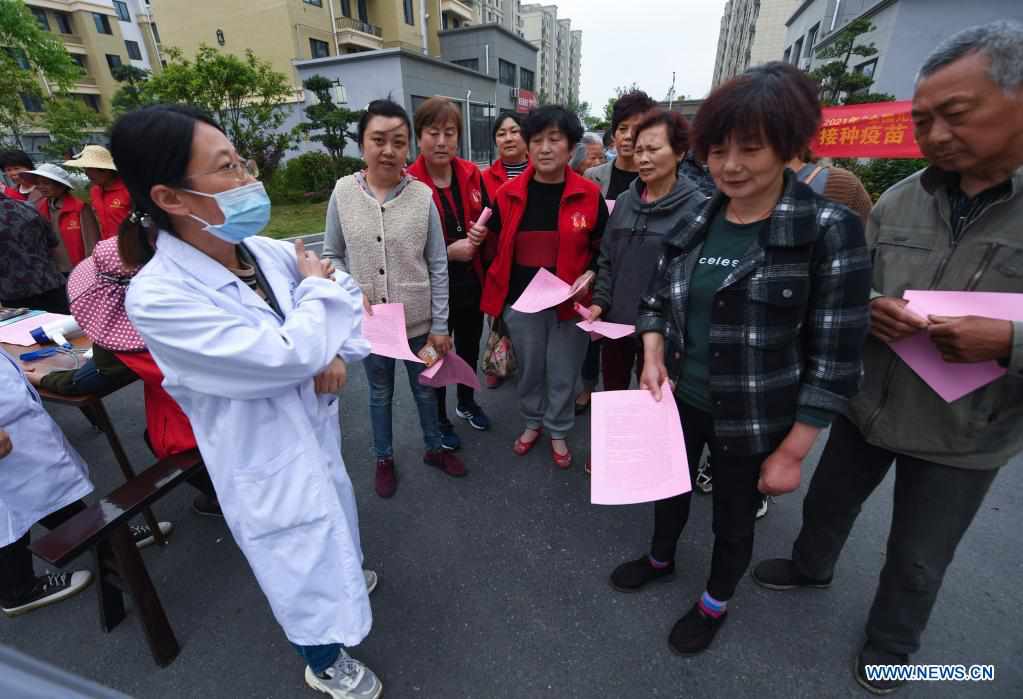 Government workers and medical professionals inform villagers of the ongoing free-of-charge COVID-19 vaccination campaign at Dongming Village, Donglin Township, Wuxing District, Huzhou City of east China's Zhejiang Province, April 27, 2021. (Xinhua/Xu Yu)