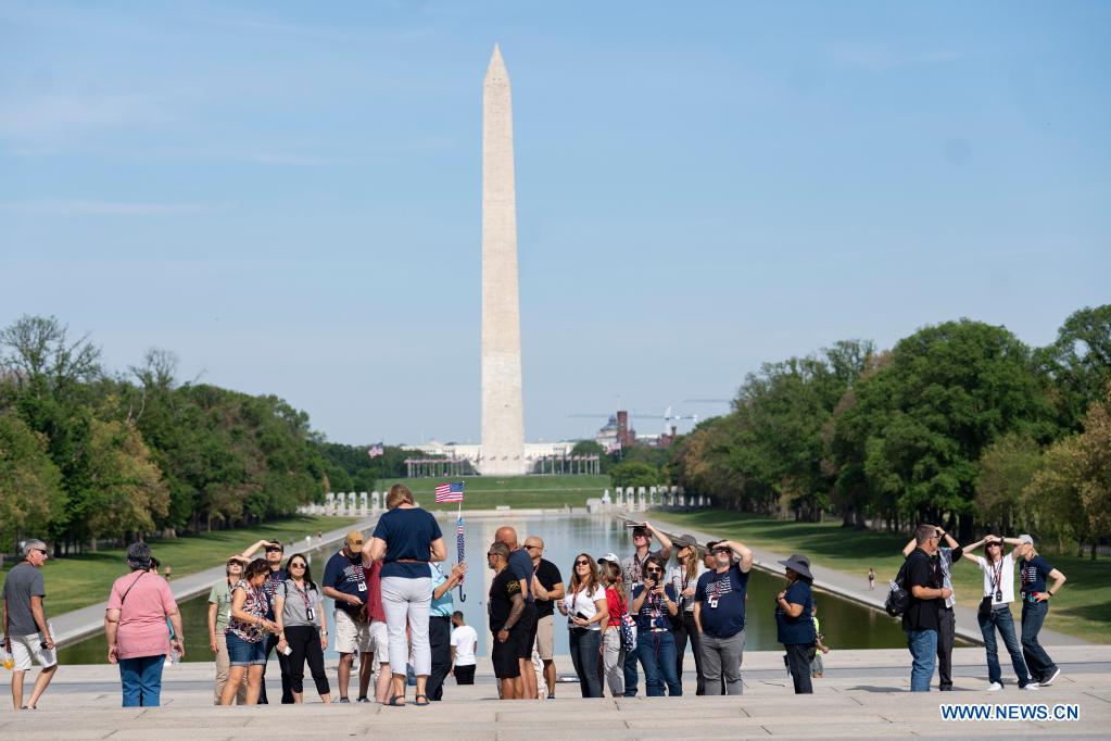 People tour the Nation Mall near the Lincoln Memorial Reflecting Pool in Washington, D.C., the United States, on April 27, 2021. The U.S. Centers for Disease Control and Prevention (CDC) unveiled new guidelines for fully vaccinated Americans on Tuesday, including activities they can safely resume without wearing masks. (Xinhua/Liu Jie)