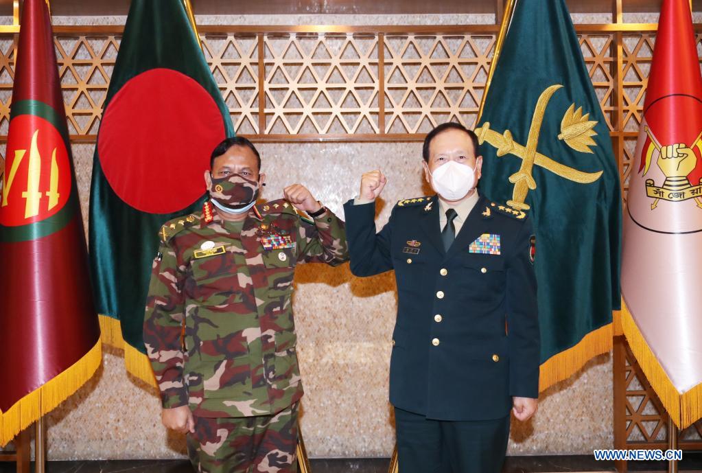 Visiting Chinese State Councilor and Minister of National Defense Wei Fenghe (R) holds talks with Bangladesh's Chief of Army Staff Aziz Ahmed in Dhaka, Bangladesh, on April 27, 2021. (Photo by Li Xiaowei/Xinhua)