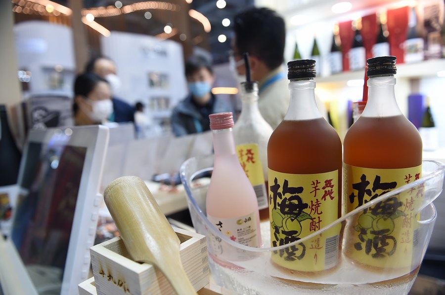 Plum wine from Japan is seen at the Food and Agricultural Products exhibition area during the third China International Import Expo (CIIE) in Shanghai, east China, Nov. 7, 2020. (Xinhua/Zhao Dingzhe)
