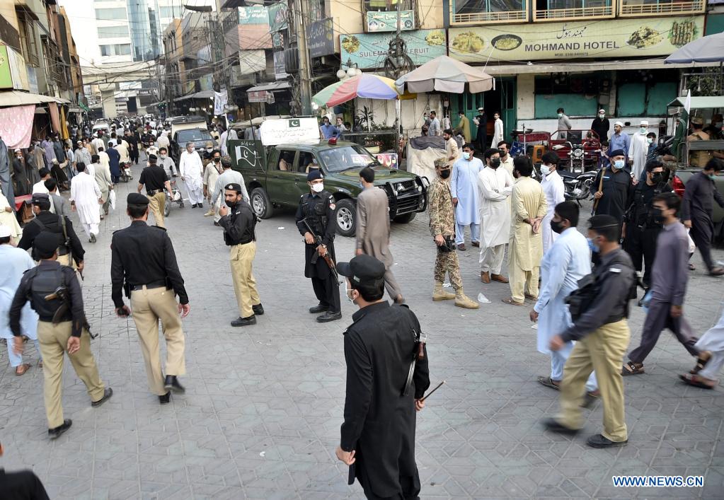 Pakistani soldiers and policemen patrol in a market in northwest Pakistan's Peshawar on April 28, 2021. Troops from the Pakistani army have been deployed in 16 cities of the country to ensure compliance with COVID-19 guidelines by the public. (Photo by Saeed Ahmad/Xinhua)