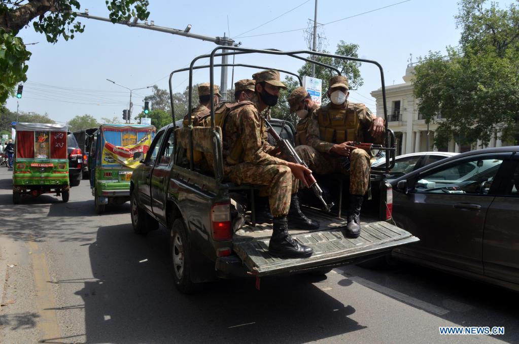 Pakistani soldiers patrol on a road in Lahore, capital city of Pakistan's Punjab province on April 28, 2021. Troops from the Pakistani army have been deployed in 16 cities of the country to ensure compliance with COVID-19 guidelines by the public. (Photo by Jamil Ahmed/Xinhua)