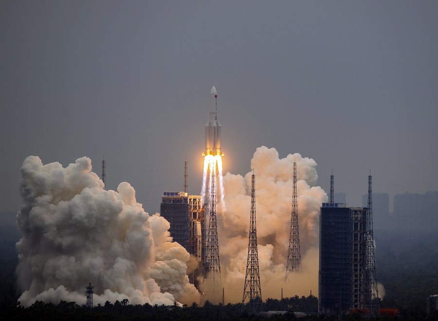 The Long March-5B Y2 rocket, carrying the Tianhe module, blasts off from the Wenchang Spacecraft Launch Site in south China's Hainan Province, April 29, 2021. China on Thursday sent into space the core module of its space station, kicking off a series of key launch missions that aim to complete the construction of the station by the end of next year. (Xinhua/Ju Zhenhua)