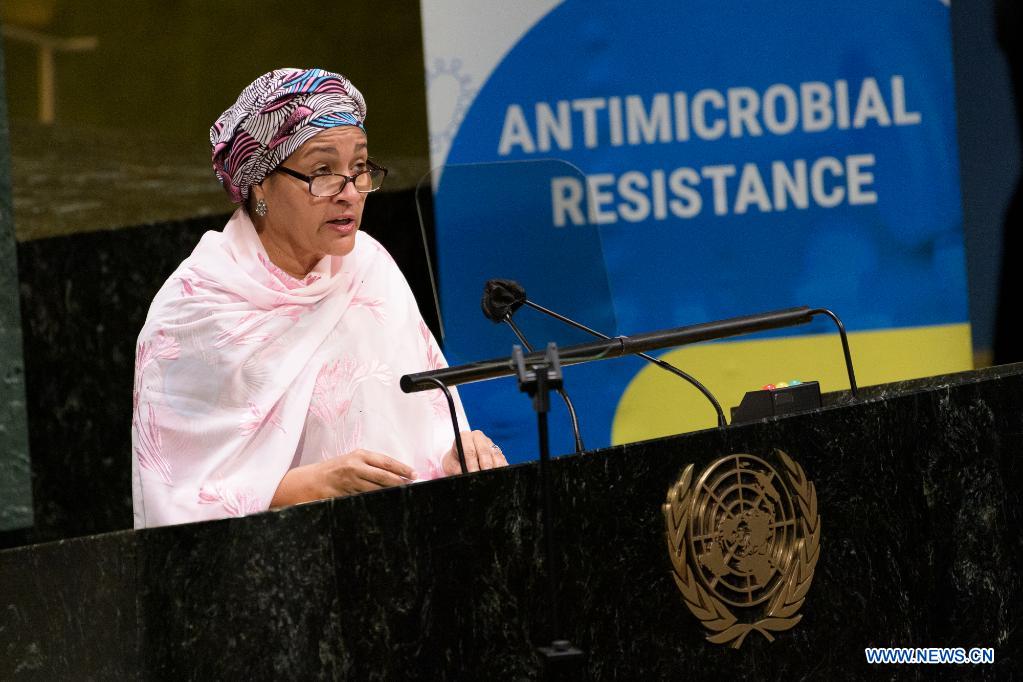 UN Deputy Secretary-General Amina Mohammed addresses the General Assembly high-level interactive dialogue on antimicrobial resistance at the UN headquarters in New York, on April 29, 2021. UN General Assembly President Volkan Bozkir on Thursday called on member states to take action on antimicrobial resistance (AMR). (Manuel Elias/UN Photo/Handout via Xinhua)