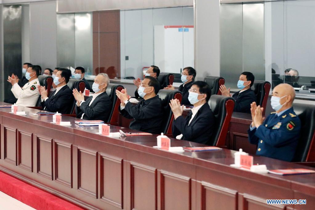 Chinese Premier Li Keqiang and member of the Secretariat of the Communist Party of China (CPC) Central Committee Wang Huning, both also members of the Standing Committee of the Political Bureau of the CPC Central Committee, watch the launch of the core module of China's space station at the Beijing Aerospace Control Center in Beijing, capital of China, April 29, 2021. China on Thursday sent into space the core module of its space station, kicking off a series of key launch missions that aim to complete the construction of the station by the end of next year. (Xinhua/Liu Weibing)
