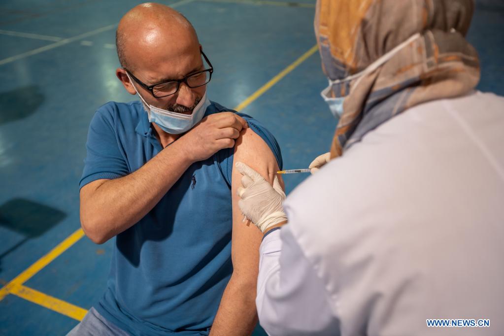 A Palestinian man receives the second dose of Chinese Sinopharm COVID-19 vaccine at a medical center during a vaccination campaign in the West Bank city of Bethlehem, April 29, 2021. (Photo by Luay Sababa/Xinhua)