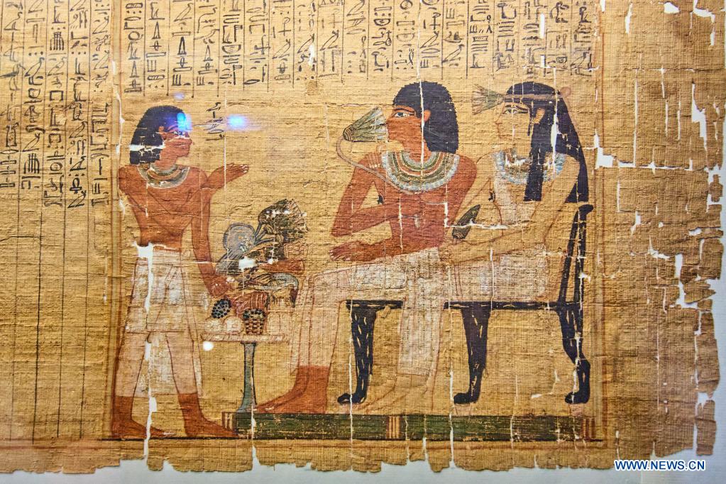 Photo taken on April 28, 2021 shows the book of the Dead of Sesostris from the 15th century BC in Papyrus Museum of Austrian National Library in Vienna, Austria. The renewed and expanded Papyrus Museum will reopen its door to public on May 4. (Photo by Georges Schneider/Xinhua)