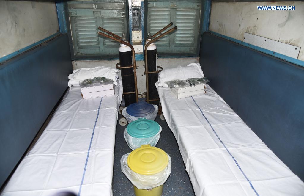 (210506) -- GUWAHATI, May 6, 2021 (Xinhua) -- A train car is seen converted into a COVID-19 care center at Guwahati railway station in Assam, India, May 5, 2021. India's COVID-19 tally surpassed 21 million on Thursday as 412,262 new cases were registered across the country in the past 24 hours, said federal health ministry. (Str/Xinhua)