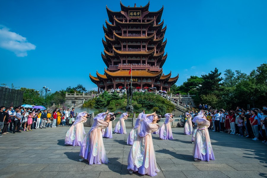 Tourists watch a performance at the Yellow Crane Tower in Wuhan, central China's Hubei Province, Oct. 1, 2020. (Xinhua/Xiao Yijiu)