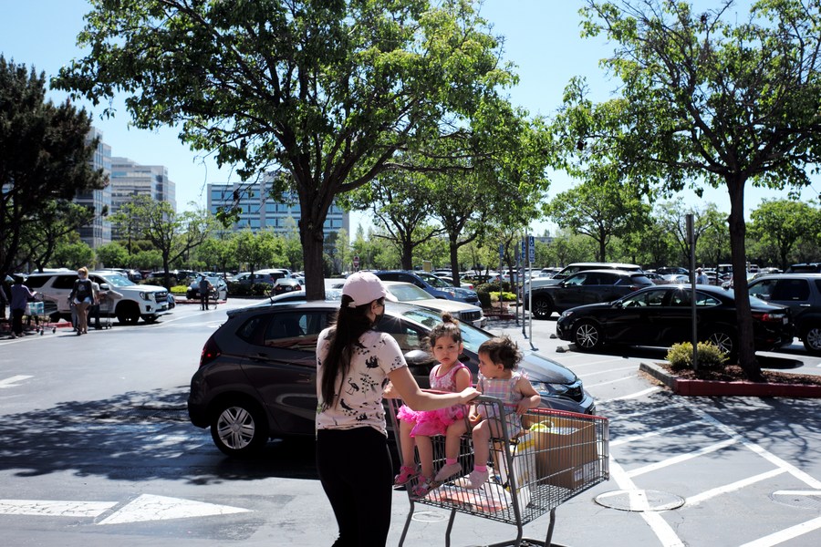 People walk to the parking lot after shopping at a supermarket in San Francisco Bay Area, California, the United States, May 4, 2021. (Xinhua/Wu Xiaoling)