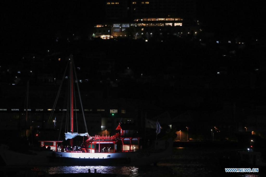 The mission ship is seen at the Nagasaki harbor during the Tokyo Olympic torch relay in Nagasaki, Japan, May 7, 2021. The Tokyo Olympic torch relay took a reconstructed mission ship used by Japanese envoys to China 1,400 years ago to mark the cultural exchange between the two neighboring East Asian countries. (Xinhua/Du Xiaoyi)