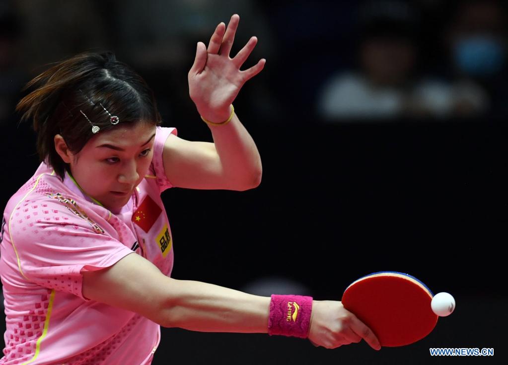 Chen Meng returns the ball during the women's singles final against Sun Yingsha at the 2021 WTT (World Table Tennis) Grand Smashes Trials and Olympic Simulation in Xinxiang, central China's Henan Province, May 7, 2021. (Xinhua/Li Jianan)