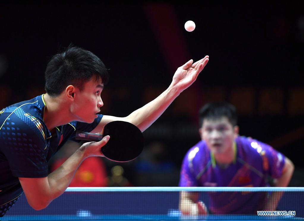 Zhou Qihao (L) serves during the men's singles final between Zhou Qihao and Fan Zhendong at the 2021 WTT (World Table Tennis) Grand Smashes Trials and Olympic Simulation in Xinxiang, central China's Henan Province, May 7, 2021. (Xinhua/Li An)