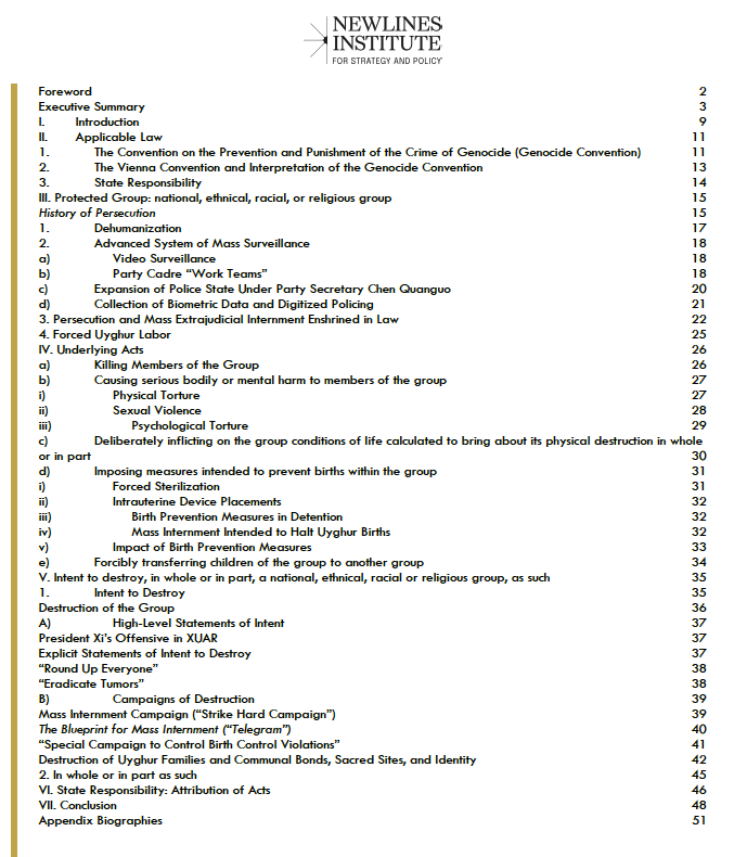 It states that ”This report is the first independent expert application of the 1948 Genocide Convention to the ongoing treatment of the Uyghurs in China. It was undertaken by the Newlines Institute for Strategy and Policy, in cooperation with the Raoul Wallenberg Centre for Human Rights, in response to emerging accounts of serious and systematic atrocities in Xinjiang province, particularly directed against the Uyghurs, an ethnic minority, to ascertain whether the People’s Republic of China is in breach of the Genocide Convention under international law.”