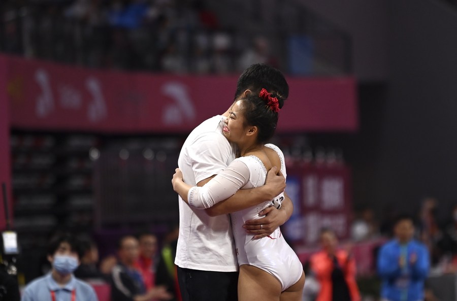 Deng Yalan (R) of Jiangxi hugs her coach after the women's vault final at the 2021 Chinese National Gymnastic Championships in Chengdu, southwest China's Sichuan Province, May 8, 2021. (Xinhua/Wang Xi)