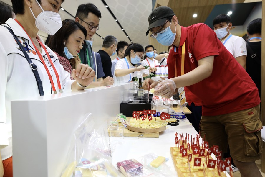 People queue up to taste Swiss cheese in the Fashion Life Exhibition Hall of the first China International Consumer Products Expo in Haikou, capital of south China's Hainan Province, May 7, 2021. (Xinhua/Jin Liwang)