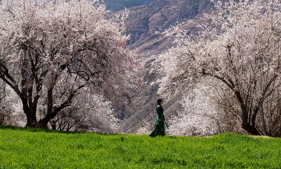 A woman walks among peach blossoms in Ridang Village of Baisong Town in Derong County, southwest China's Sichuan Province, April 3, 2021. Peach blossoms are in full bloom in Derong County. In recent years, the local government has taken advantage of the natural resources to develop rural tourism and help increase villagers' income. (Xinhua/Jiang Hongjing)