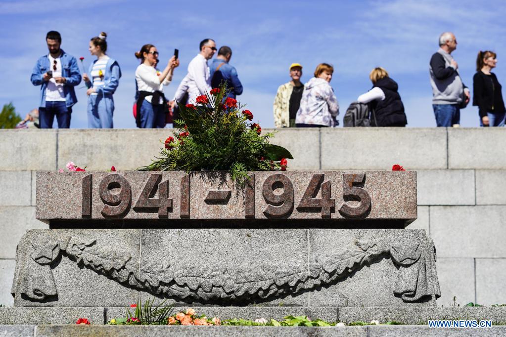 People gather at the Soviet Memorial in Treptower Park to mark the 76th anniversary of the end of World War II in Europe, known as Victory in Europe Day, in Berlin, capital of Germany, May 9, 2021. (Photo by Stefan Zeitz/Xinhua)