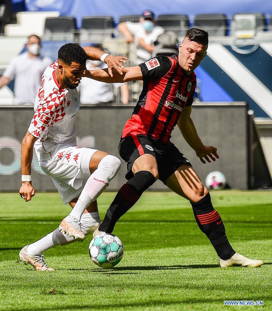 Luka Jovic (R) of Frankfurt vies with Jeremiah St. Juste of Mainz during a German Bundesliga match between Eintracht Frankfurt and FSV Mainz 05 in Frankfurt, Germany, May 9, 2021. The match ended 1-1. (Xinhua)