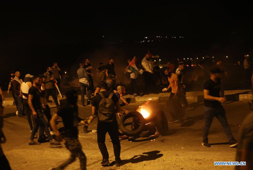 Protesters burn tires during clashes with Israeli soldiers at Huwwara checkpoint near the West Bank city of Nablus, on May 10, 2021. Tension between Israelis and Palestinians has been flaring up over the past few days amid the escalating violence in East Jerusalem between Palestinian demonstrators and Israeli forces. (Photo by Ayman Nobani/Xinhua)