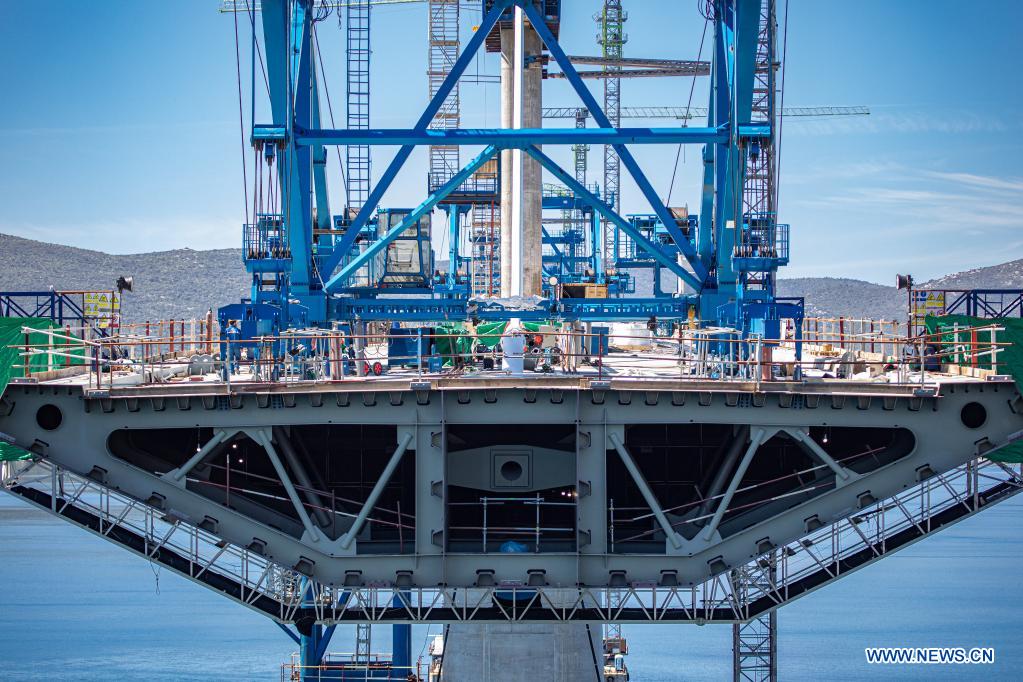 Photo taken on May 10, 2021 shows the construction site of the Peljesac Bridge near Komarna, Croatia. In January 2018, a Chinese consortium led by the China Road and Bridge Corporation (CRBC) won the bid for the first phase of the bridge and its access roads. Construction started six months later. The construction of the Peljesac Bridge will be completed in June 2022. (Grgo Jelavic/Pixsell via Xinhua)