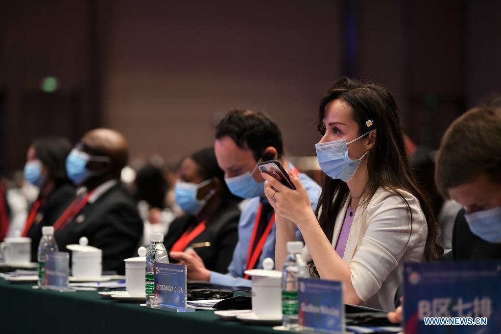 Guests attend the opening ceremony of the Fifth Silk Road International Exposition and the Investment and Trade Forum for Cooperation between East and West China in Xi'an, capital of northwest China's Shaanxi Province, May 11, 2021. The Fifth Silk Road International Exposition opened Tuesday in Xi'an, capital of northwest China's Shaanxi Province, with deeper Belt and Road economic cooperation one of the hot topics on agenda. Themed "Interconnection, Contribution and Shared Benefits," the expo has attracted more than 1,900 envoys and guests from 98 countries and regions such as Belgium, the Republic of Korea, Tajikistan and Zambia. (Xinhua/Zhang Bowen)