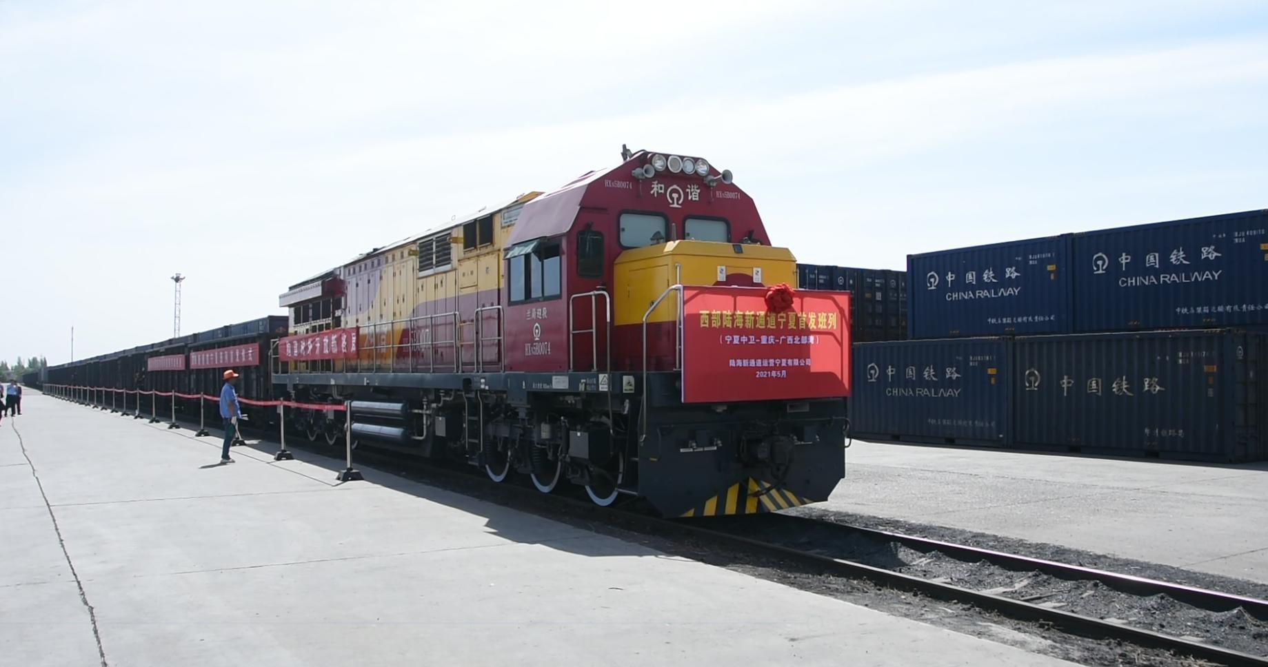 A freight train, first in northwest China's Ningxia Hui Autonomous Region serving the New International Land-Sea Trade Corridor, departed the city of Zhongwei for Chongqing on Tuesday. (Xinhua/Lyu Ze)