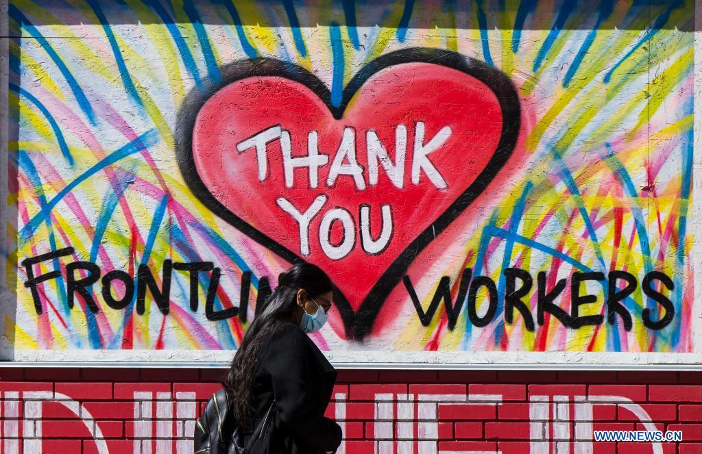 A woman wearing a face mask walks past a mural in Toronto, Ontario, Canada, on May 12, 2021. As of Wednesday afternoon, Canada reported a cumulative total of 1,305,174 COVID-19 cases, including 24,765 deaths, according to CTV. (Photo by Zou Zheng/Xinhua)