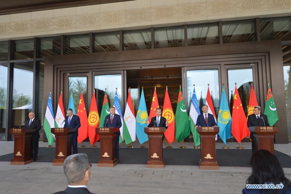 Chinese State Councilor and Foreign Minister Wang Yi and foreign ministers of five Central Asian countries meet the press after the second meeting of China + Central Asia (C+C5) foreign ministers meeting in Xi'an, capital of northwest China's Shaanxi Province, May 12, 2021. The meeting was hosted by Wang Yi and attended by Kazakh Deputy Prime Minister and Foreign Minister Mukhtar Tleuberdi, Kyrgyz Foreign Minister Ruslan Kazakbaev, Tajik Foreign Minister Sirojiddin Muhriddin, Turkmen Deputy Prime Minister and Foreign Minister Rashid Meredov, and Uzbek Foreign Minister Abdulaziz Kamilov. (Xinhua/Zhao Yingbo)